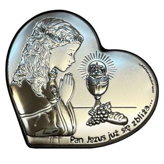 Obraz srebrny I Komunia Św. 8x7cm Dziewczynka z kliechem w sercu (napis)