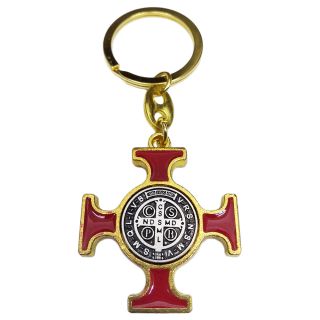 Brelok metalowy - krzyż Św. Benedykta z CZERWONĄ wkładka na "złotym" łańcuszku