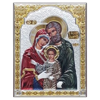 Ikona (grecka) srebrno-kolorowa częściowo pozłacana Św. Rodzina 14x18 cm