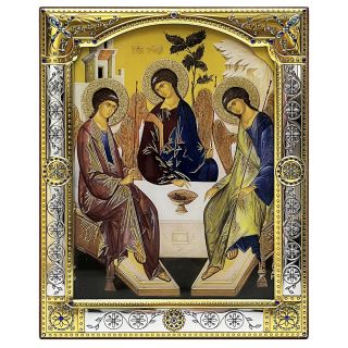 Ikona (grecka) srebrna kolorowa Trójca Rublowa 17x21 cm. z szybką