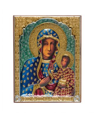 Ikona (grecka) srebrno kolorowa częściowo pozłacana Matka Boża Nieustającej Pomocy 18x23cm