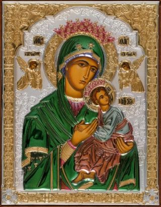 Ikona (grecka) srebrno-kolorowa pozłacana Matka Boża Nieustającej Pomocy 14x18 cm
