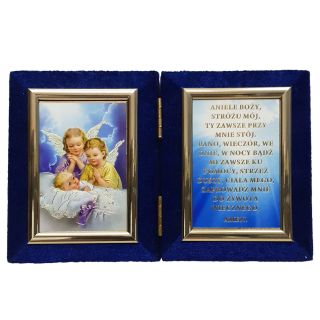 Ikona DYPTYK Dwa aniołki nad dzieckiem/MODLITWA: Aniele Boży... drewniana składana 8cm