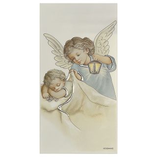Obrazek na płycie 18x23cm Anioł Stróż nad dzieckiem (latarka) NIEBIESKI