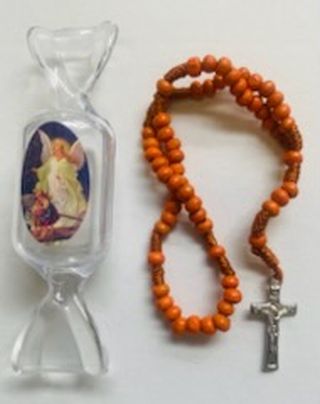 Mini rózaniec drewniany na sznurku w opakowaniu w formie cukierka.